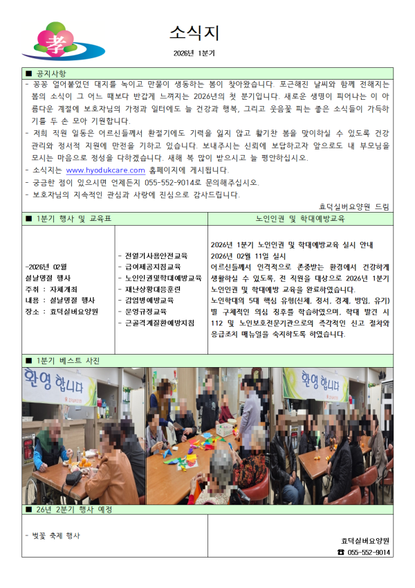 효덕실버요양원에서 2026년 1분기 보호자와의 소통노력 소식지를 전합니다. 페이지 정보 작성자 최고관리자 댓글 0건 조회 113회 작성일 26-03-13 01:11 목록 본문 효덕실버요양원에서 2026년 1분기 보호자와의 소통노력 소식지를 전합니다. 이전글감사합니다~^^ 26.03.13 다음글노인학대, 폭력에 대한 대응지침 26.03.13 댓글 0 댓글목록 등록된 댓글이 없습니다.