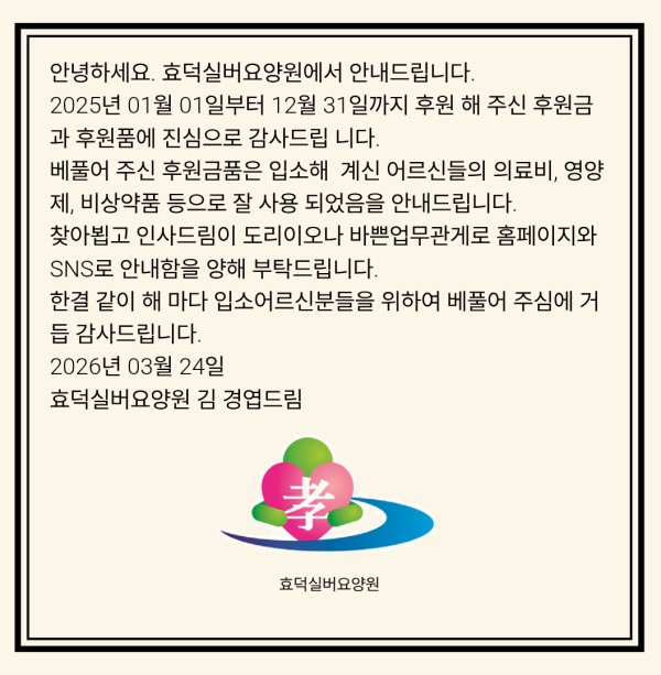 안녕하세요. 효덕실버요양원에서 안내드립니다.